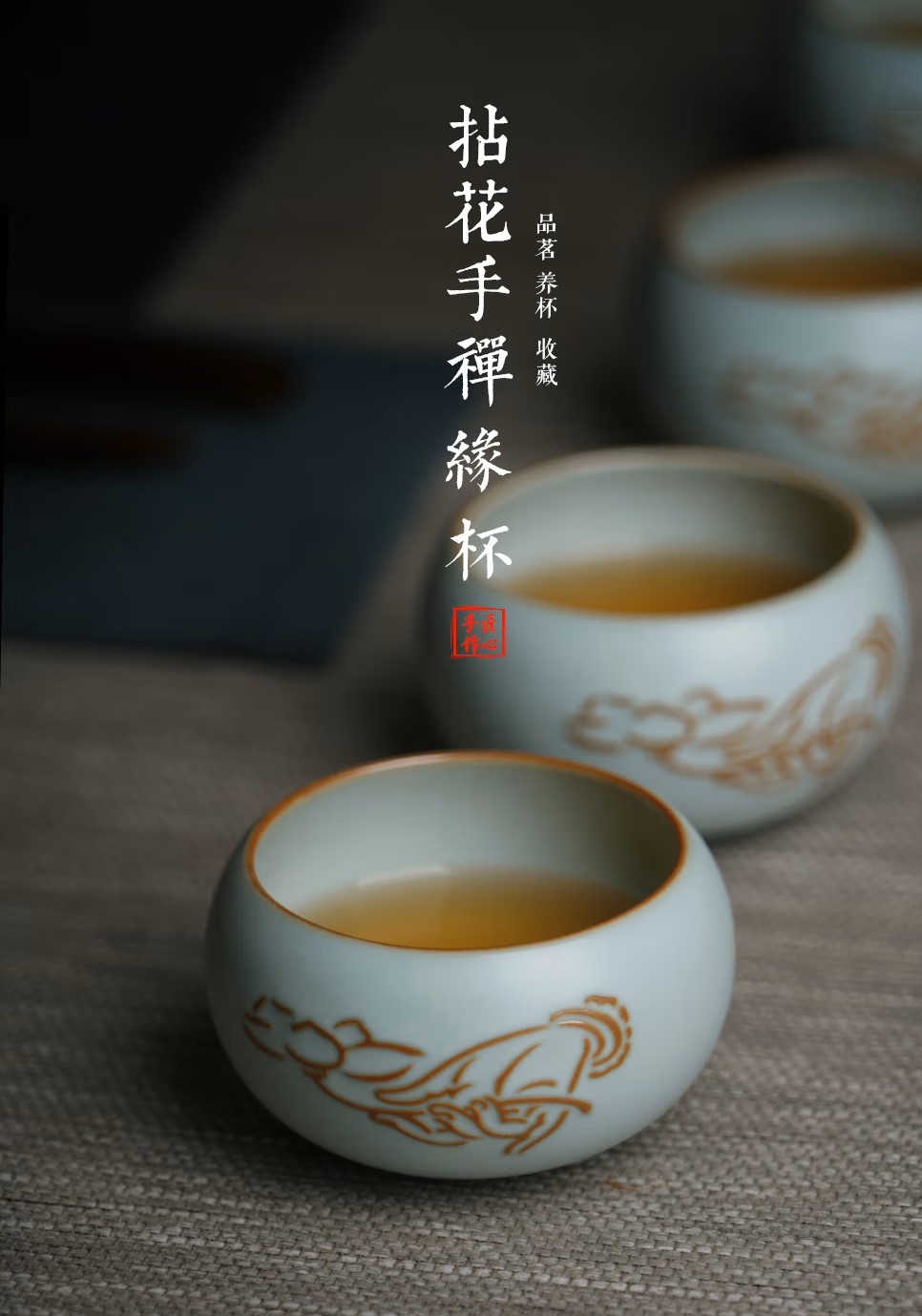 青澹窑汝瓷-拈花手禅缘杯(小) 开片可养 口沿金线 冰裂釉 手工汝瓷礼盒装