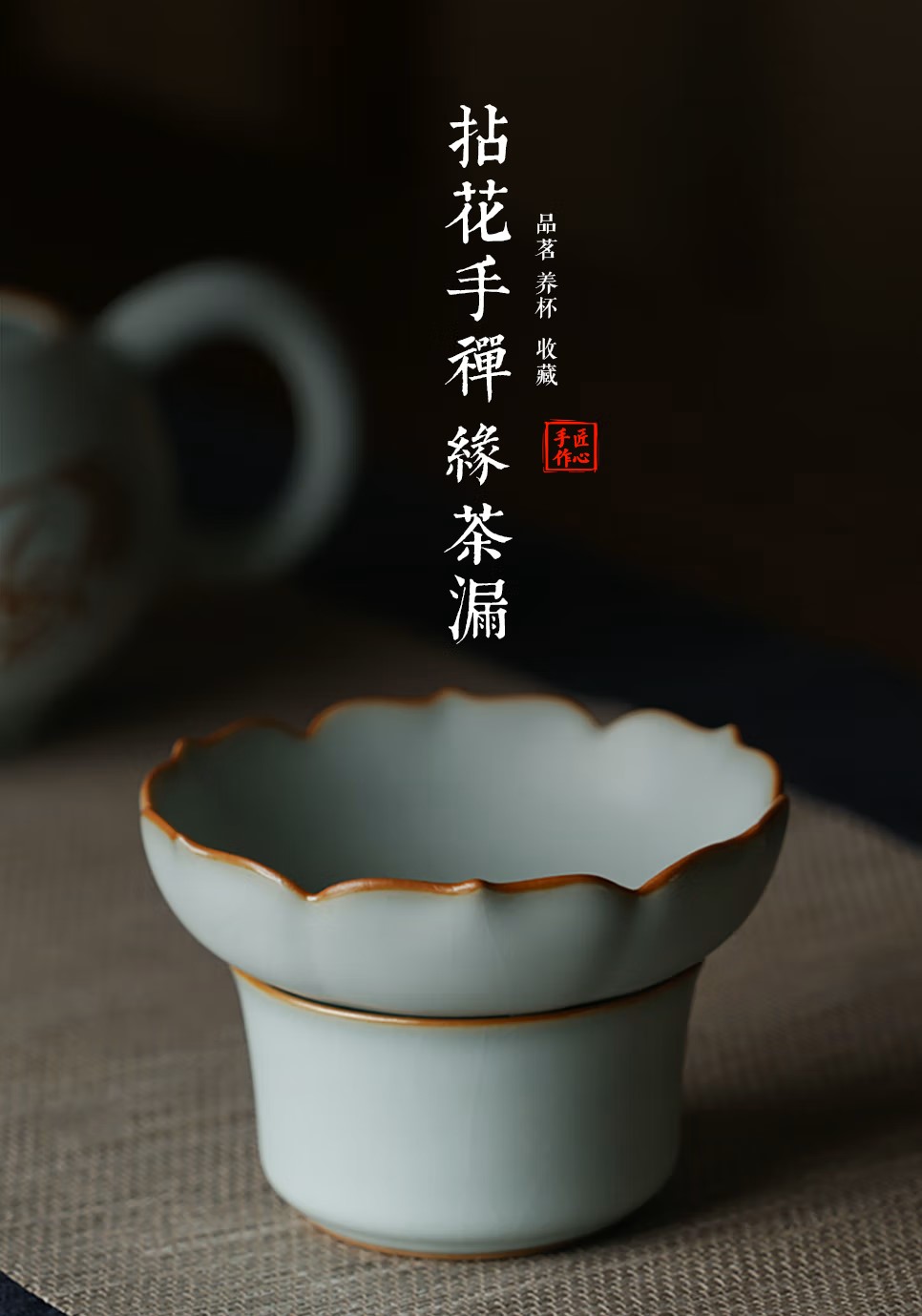青澹窑汝瓷-拈花手禅缘茶漏 开片可养 口沿金线 冰裂釉 手工汝瓷礼盒装